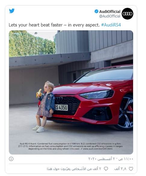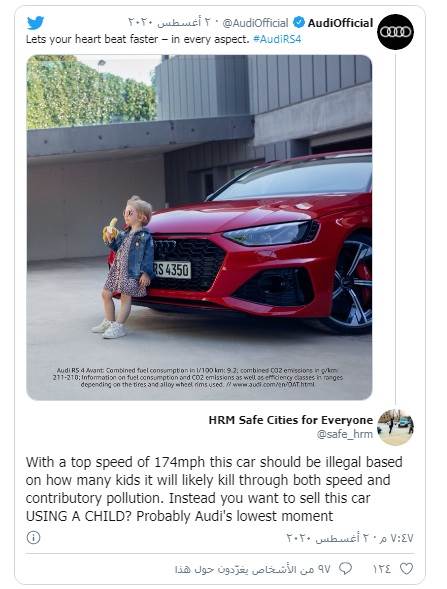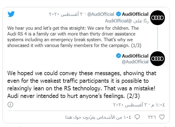 وغرّدت "أودي" على حسابها في "تويتر": "نسمعكم، ودعونا نوضح هذا: نحن نهتم بالأطفال"، مضيفة "نعتذر بصدق عن هذه الصورة غير الحساسة".