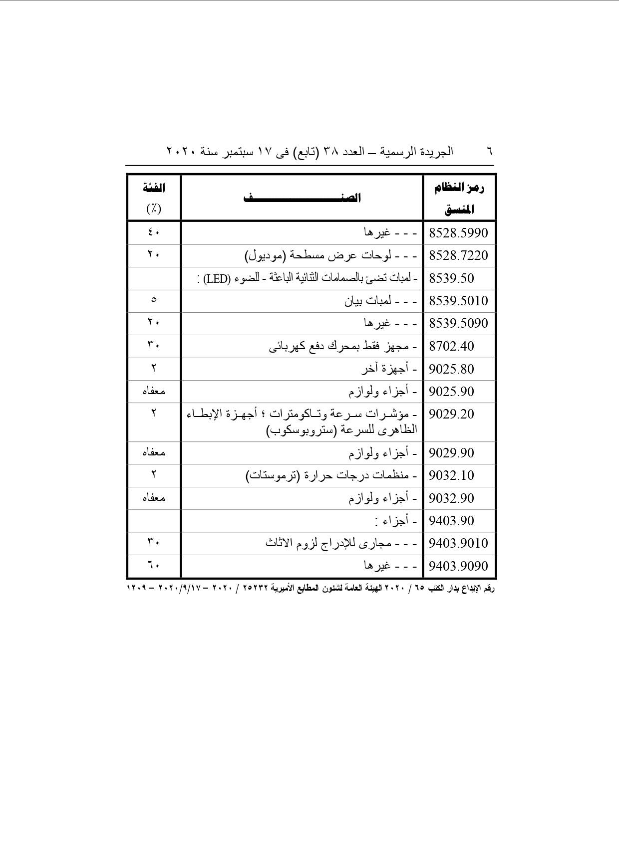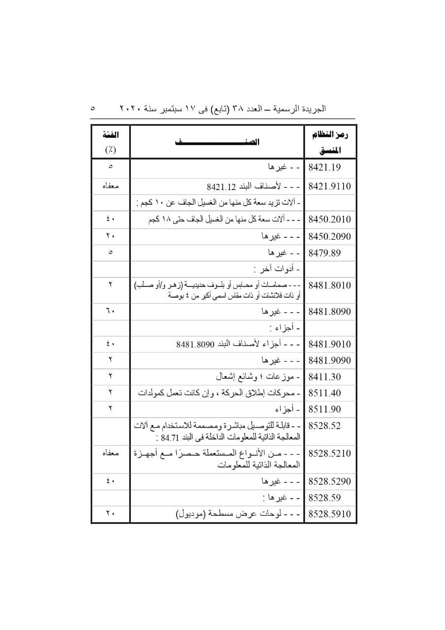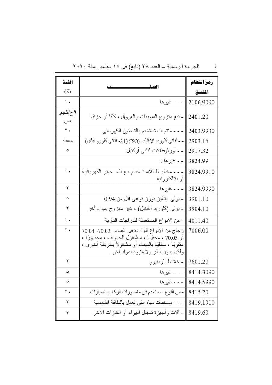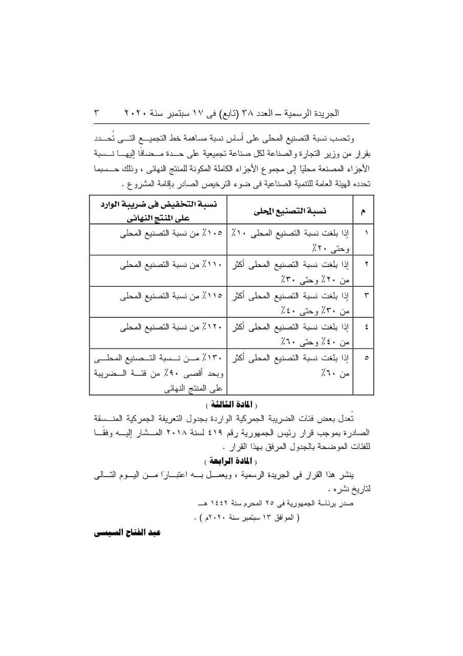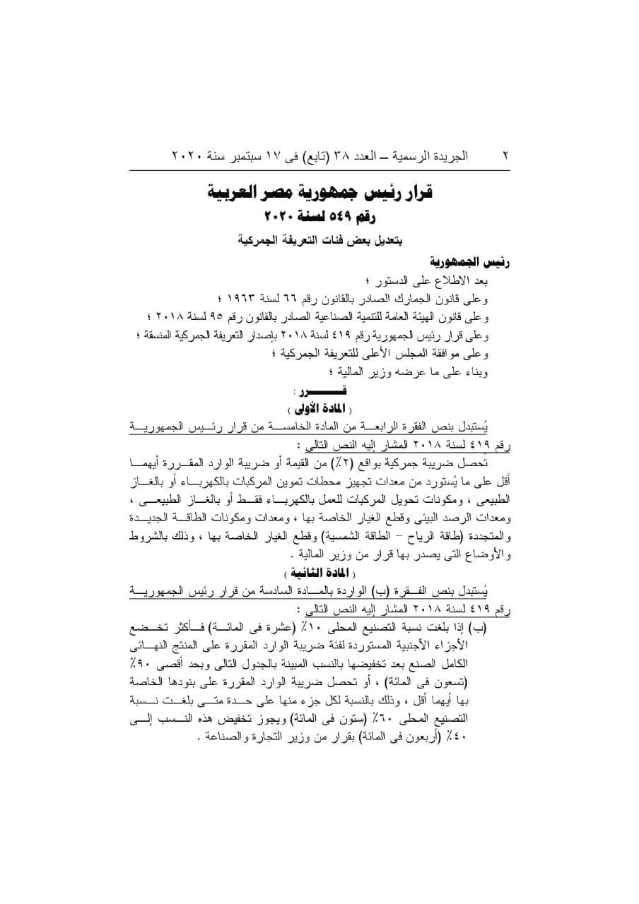 أصدر الرئيس عبد الفتاح السيسى القرار رقم 459 لسنة 2020، بتعديل بعض مواد وفئات التعريفة الجمركية الواردة بقرار رئيس الجمهورية رقم 419 لسنة 2018 بإصدار التعريفة المنسقة.