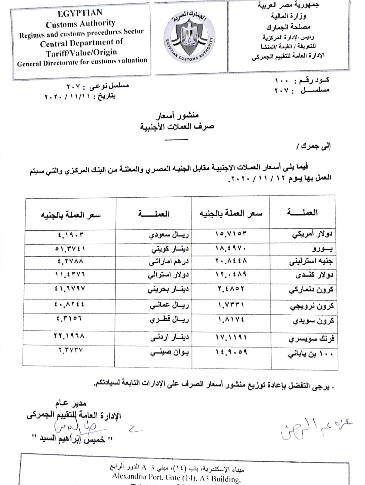 واصدرت مصلحة الجمارك منشور الأسعار رقم 207 لسنة 2020 الصادر من الإدارة العامة للتقييم الجمركى بالإدارة المركزية للتعريفة والقيمة والمنشأ بمصلحة الجمارك، والخاص بأسعار العملات الأجنبية مقابل الجنيه المصرى والمعلنة من البنك المركزى والتى سيتم العمل بها يوم 2020/11/12 ، وتم تحديد سعر الدولار عند 15.71 جنيه.