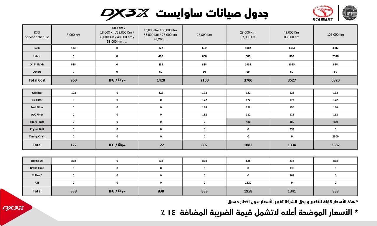 أعلنت مجموعة IFG جروب وكيل سيارات ساوإيست في مصر عن جدول صيانات DX3 الجديدة في مصر والتي تأتي كما في الصورة الموضحة والتي لا تشمل ضريبة القيمة المضافة بقيمة 14% .