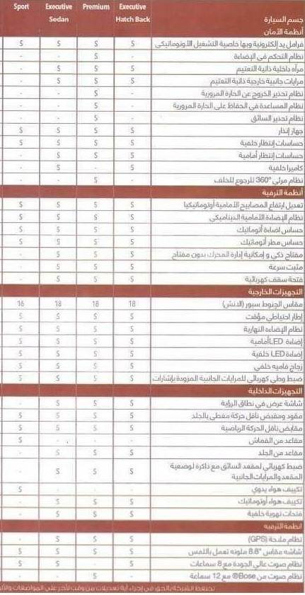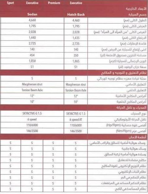 ويتوافر الإصدار الثاني “السيدان”، بـ 3 فئات من التجهيزات، وتوضح الصور التالية مواصفات مازدا هاتشباك وأوتوماتيك.