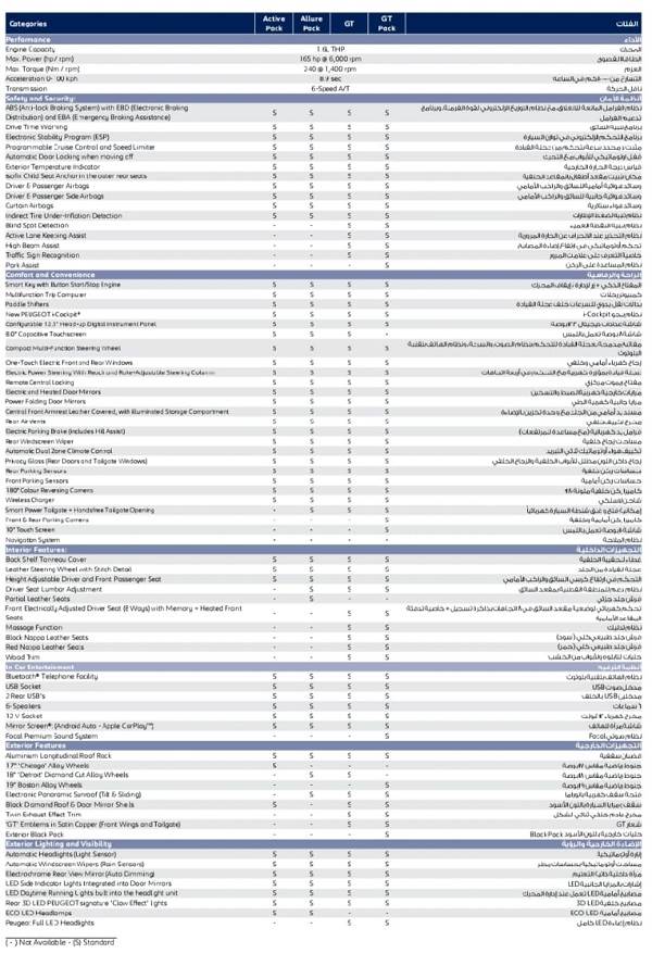 ويقدم “مارشدير”، في الشكل التالي مقارنة شاملة بين الفئات الـ 4 من السيارة الجديدة، من واقع الكتيب الخاص بـ”بيجو 3008”.