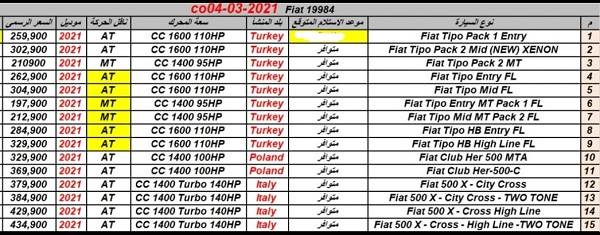 أخطرت شركة دايناميكس، الوكيل الحصري لعلامة فيات الإيطالية في مصر، عن أحدث قائمة سعرية لسيارات فيات في مصر خلال شهر مارس.
