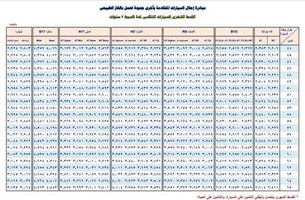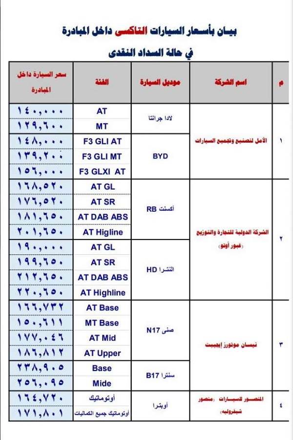 رابعاً أسعار السيارات التاكسي المشاركة في مبادرة الإحلال “نقداً”