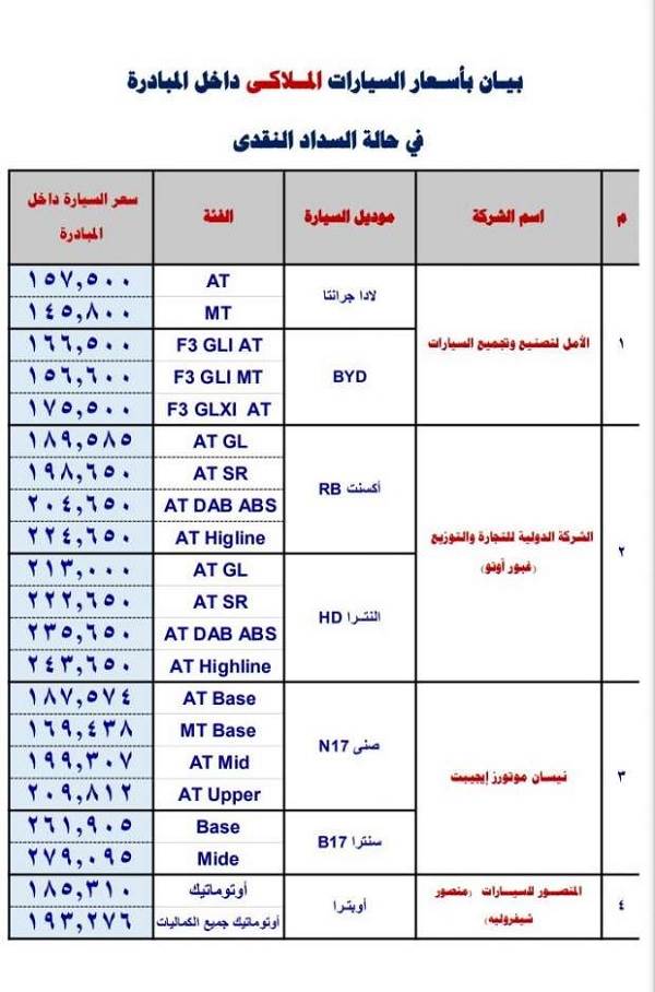 أولاً أسعار السيارات الملاكي المشاركة في مبادرة الإحلال “نقداً”