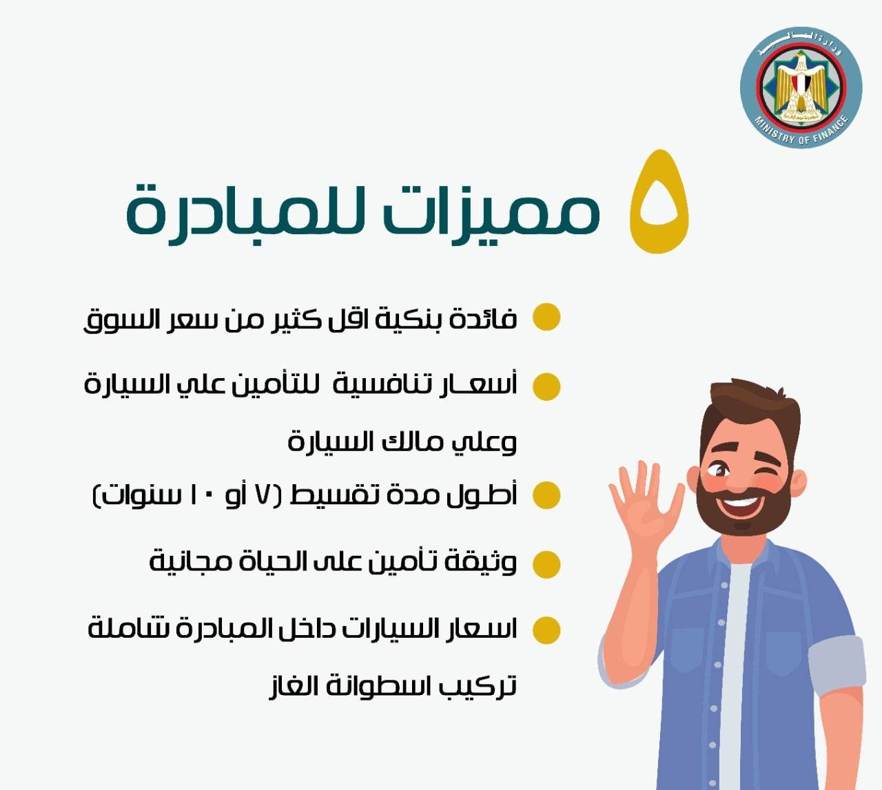وقالت الصفحة أن هذه المزايا تشمل أقل سعر للفائدة في السوق بواقع نسبة 3% مقطوعة على تقسيط السيارة مع أطول فترة سداد بين 7 و10 سنوات بالاضافة الي التأمين على السيارة بأسعار غير مسبوقة في السوق مع تأمين مجاني على الحياة بوثيقة قيمتها 100 ألف جنيه بالاضافة الي الحافز الأخضر الذي يتم تقديمه على السيارات المشاركة في المبادرة مع أسعار مميزة للسيارات في مبادرة الاحلال شاملة قيمة تركيب أسطوانة الغاز.