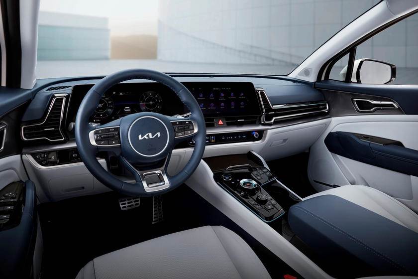 أما المقصورة الداخلية , فهي جريئة كما التصميم الخارجي. وتتميز لوحة العدادات الموجهة للسائق بشاشة منحنية متكاملة تضم كلاً من العدادات ونظام المعلومات الترفيهي. وتتميز فتحات التهوية بمظهر ثلاثي الأبعاد وتقع مباشرة في الشاشة. ولم تقدم كيا أبعاد حجم الشاشة حتى الآن. كما يأتي الكونسول المركزي بمظهر لامع عالي الجودة ويحتوي على مقبض اختيار التروس والعديد من الوظائف الأخرى. ولا تزال هناك أزرار فعلية لأشياء مثل التحكم في درجة الحرارة.