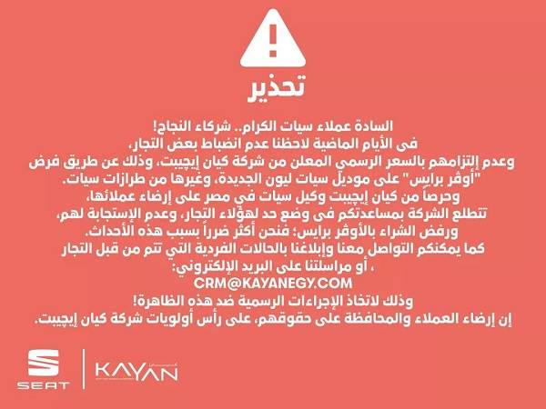 أصدرت شركة كيان إيجيبت، وكيل علامة سيات في مصر، بياناً تحذيرياً، يتعلق بالزيادات السعرية غير الرسمية التي فرضها بعض التجار على السيارة سيات ليون الجديدة كلياً التي تم طرحها قبل أيام قليلة.