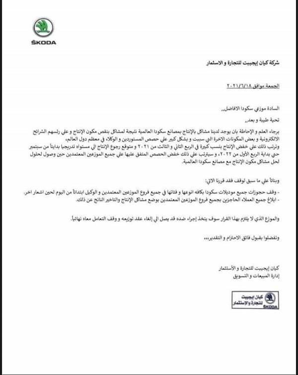 ووفقاً لمنشور وكيل سكودا، فإن أزمة نقص المكونات الحالية سوف تؤثر على خفض الحصص المتفق عليها لجميع الموزعين المعتمدين لحين التوصل إلى حلول للأزمة الحالية بمصانع سكودا العالمية.