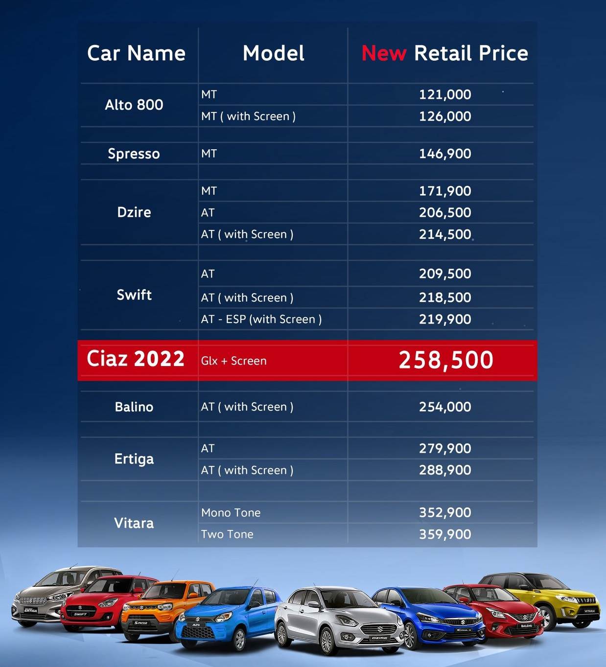 نشرت شركة الطارق أحد موزعي سيارات سوزوكي في مصر قائمة بأحدث أسعار سيارات سوزوكي محلياً. وياتي ذلك في أعقاب طرح موديلات سياز 2022 الجديدة التي تأتي بزيادة في السعر من 254.900 ألف جنيه الي 258.900 ألف جنيه.