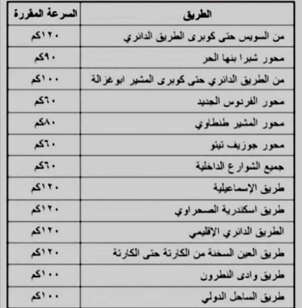 وينشر “مارشدير”، في الجدول التالي، السرعات المقررة للطرق وفقاً للمعلن من الإدارة العامة للمرور.