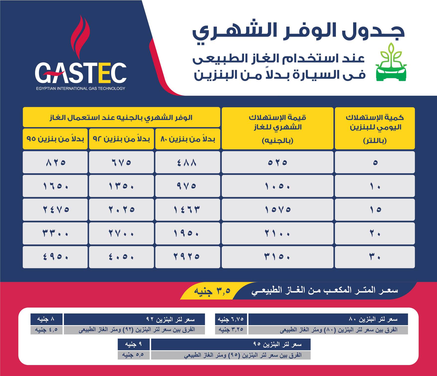 وقالت الشركة أن قيمة التوفير بالنسبة لمن يستهلك 5 لتر يومياً من الوقود قرابة 488 جنيه شهرياً بدلاً من بنزين 80 و825 جنيه بدلاً من بنزين 95 و675 جنيه توفير بدلاً من بنزين 92. ويتدرج التوفير الي 2925 جنيه بدلاً من بنزين 80 لمن يستخدم 30 لتر يومياً وصولاً الي 4950 جنيه شهرياً توفير بدلاً من بنزين 95. ويبلغ سعر المتر المكعب من الغاز الطبيعي 3.5 جنيه.