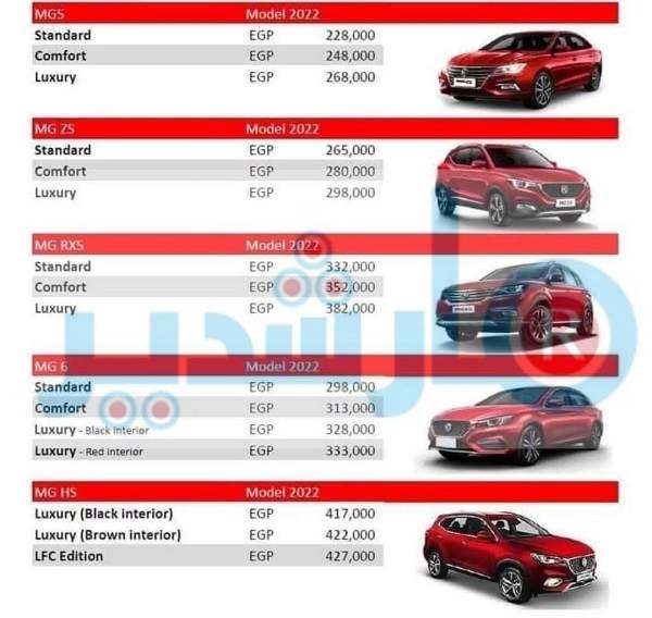وتتوافر سيارات MG في مصر بسيارتينسيدان هما “إم جي 5، وإم جي 6”، و3 سيارات SUV هما "إم جي ZS، وإم جي RX5، وإم جي HS".