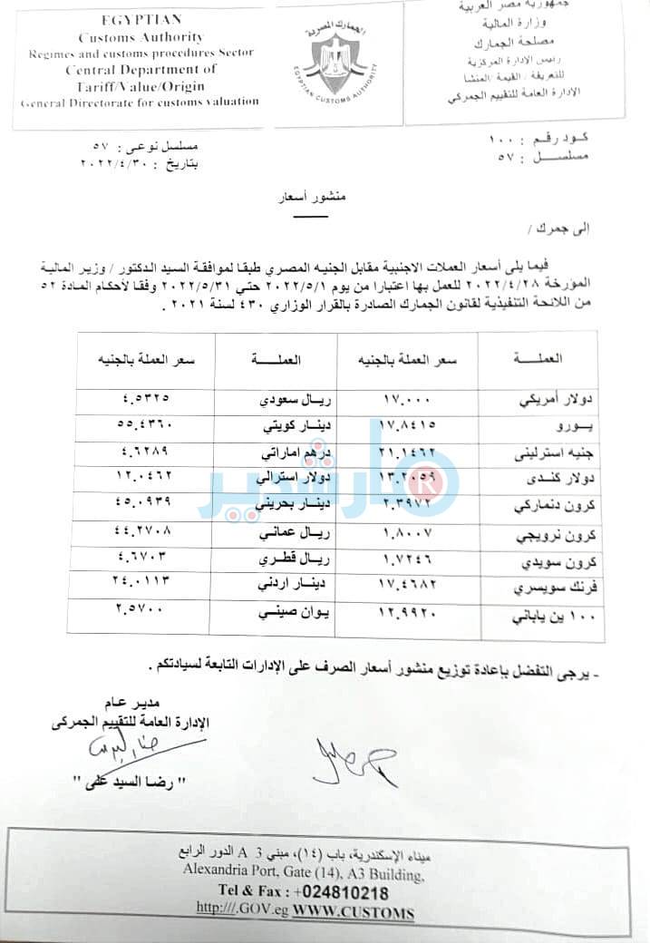 اصدرت وزارة المالية منشور أسعار رقم 57 لسنة 2022 بأسعار صرف العملات الأجنبية من يوم 1 مايو 2022 حتى 31 مايو