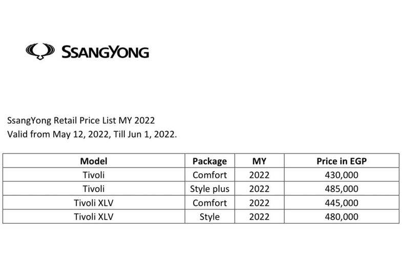 كشفت شركة عربيات وكيل سانج يونج في مصر عن أسعار طرازاتها الجديدة في مصر بعد زياداتها بداية من اليوم في ظل ارتفاع سعر الدولار الجمركي في الفترة الأخيرة وما سبقها من زيادات. وجاءت أسعار السيارات كالتالي :