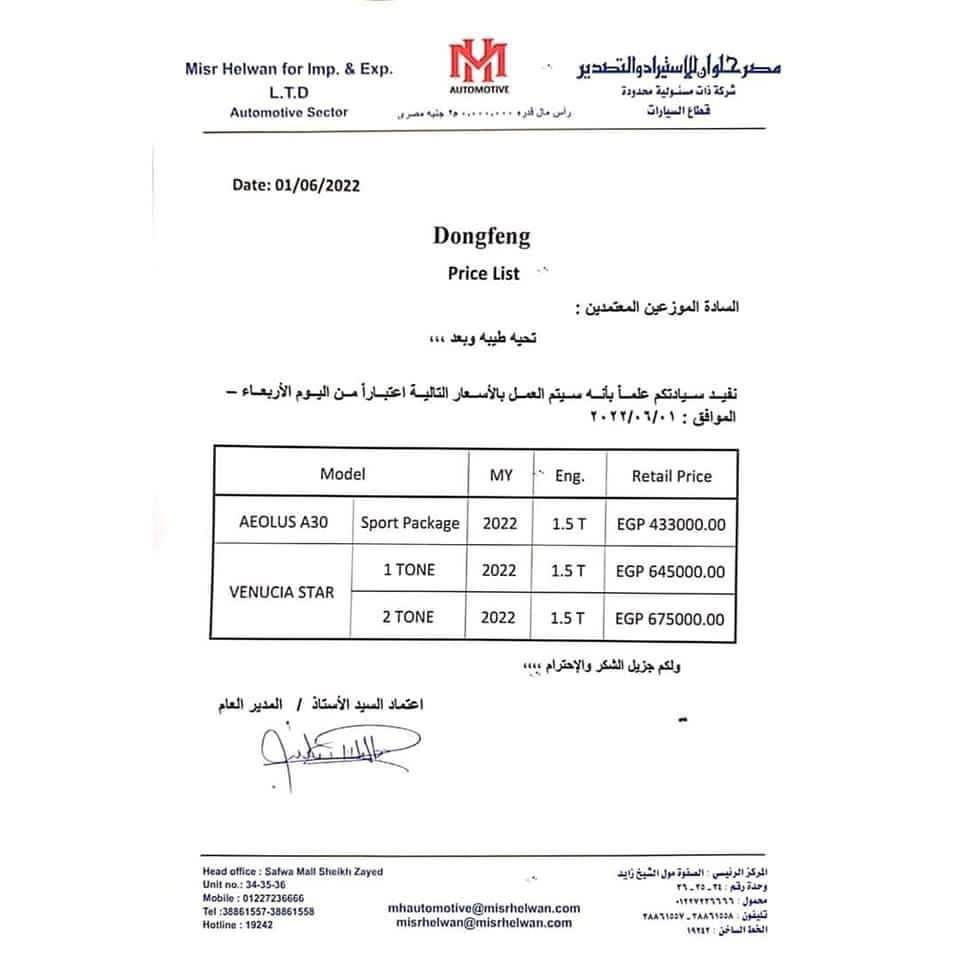أعلنت مصر حلوان أوتوموتيف عن قائمة تضم أسعار طرازات دونجفينج في السوق المحلي خلال شهر يونيو. وشملت القائمة أسعار طرازات أيولوس A30 وفينوشيا ستار متعددة الاستخدامات الجديدة بمصر.