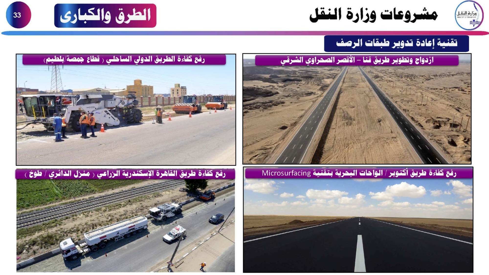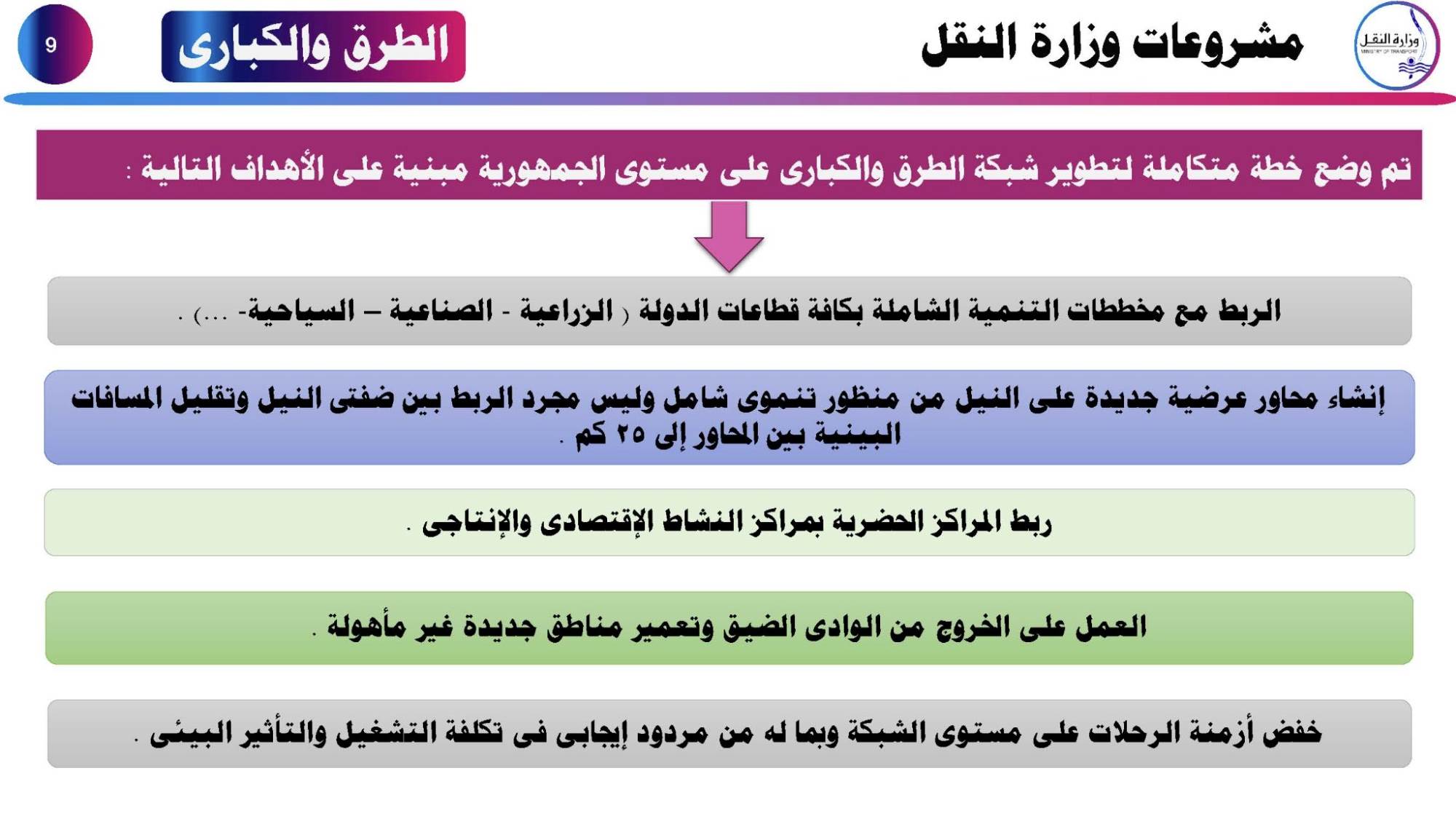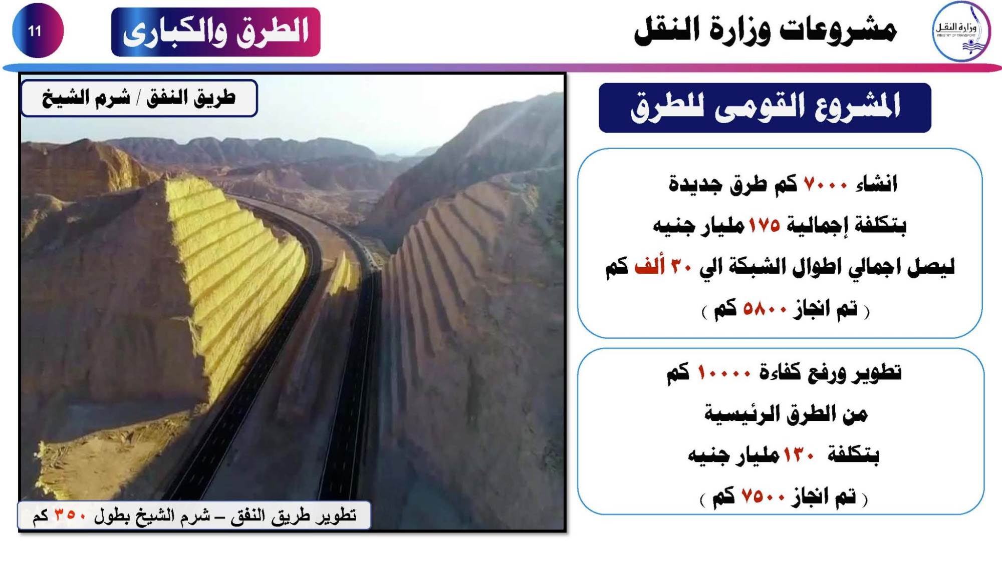 مشروعات عديدة للطرق في مصر كشفت وزارة النقل عن تطوير قطاعات النقل المختلفة وقدمت انفوجراف يوضح ماتم تنفيذه من هذه الخطة خلال ال 8 سنوات الماضية فيما يتعلق بمشروعات الطرق والكبارى .