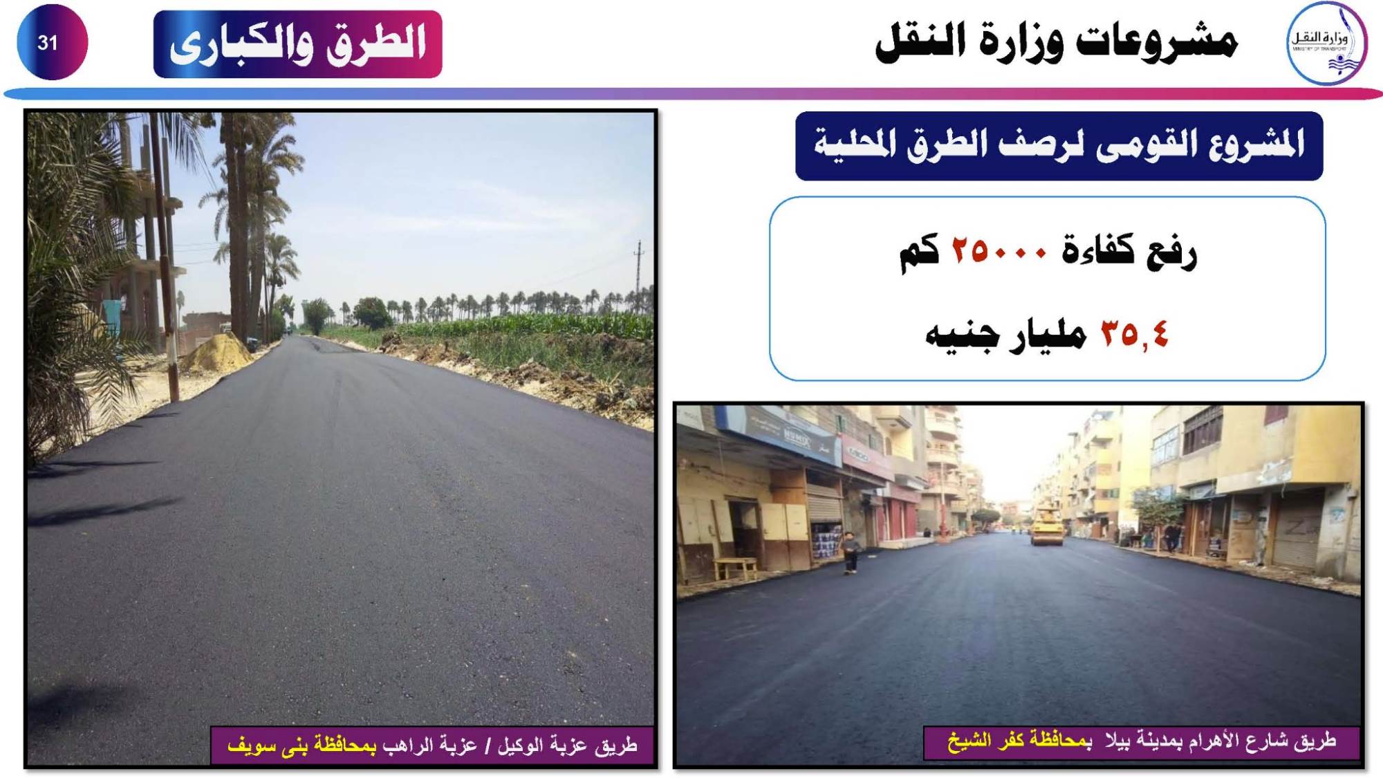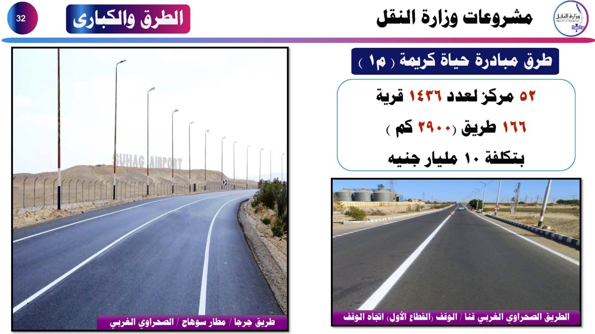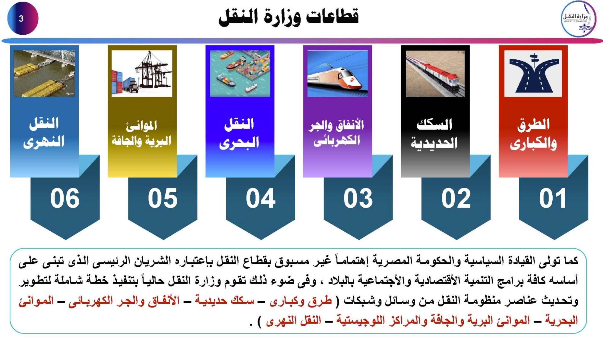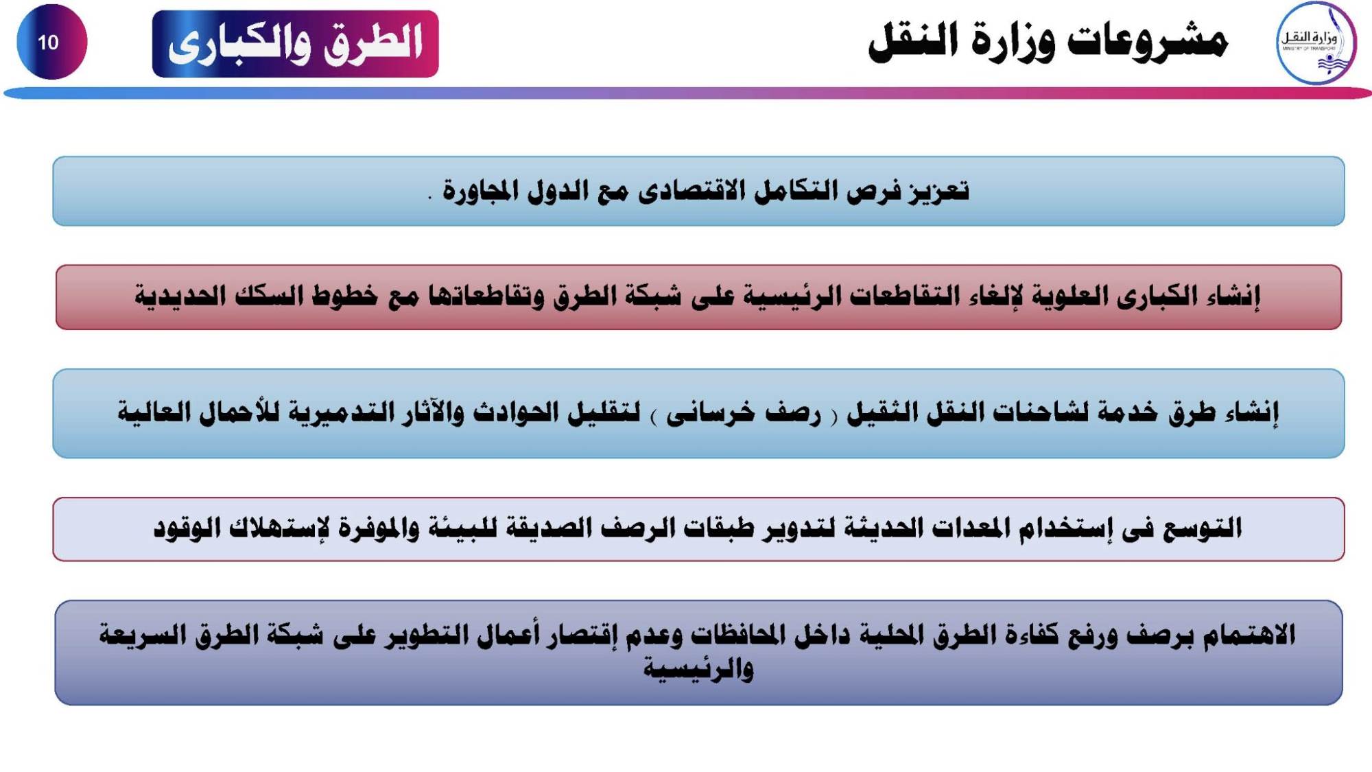 مشروعات عديدة للطرق في مصر كشفت وزارة النقل عن تطوير قطاعات النقل المختلفة وقدمت انفوجراف يوضح ماتم تنفيذه من هذه الخطة خلال ال 8 سنوات الماضية فيما يتعلق بمشروعات الطرق والكبارى .