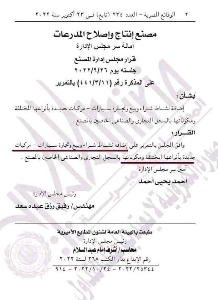 وقد وافق المجلس بالتمرير على اضافة نشاط شراء وبيع وتجارة السيارات أو المركبات الجديدة بأنواعها المختلفة ومكاوناتها بالسجل التجاري والصناعي الخاصين بالمصنع . وتم نشر القرار في الوقائع المصرية العدد 234 بتاريخ 23 أكتوبر الجاري. وكان القرار قد تم اتخاذه حسب المنشور في جلسة يوم 26 سبتمبر الماضي .