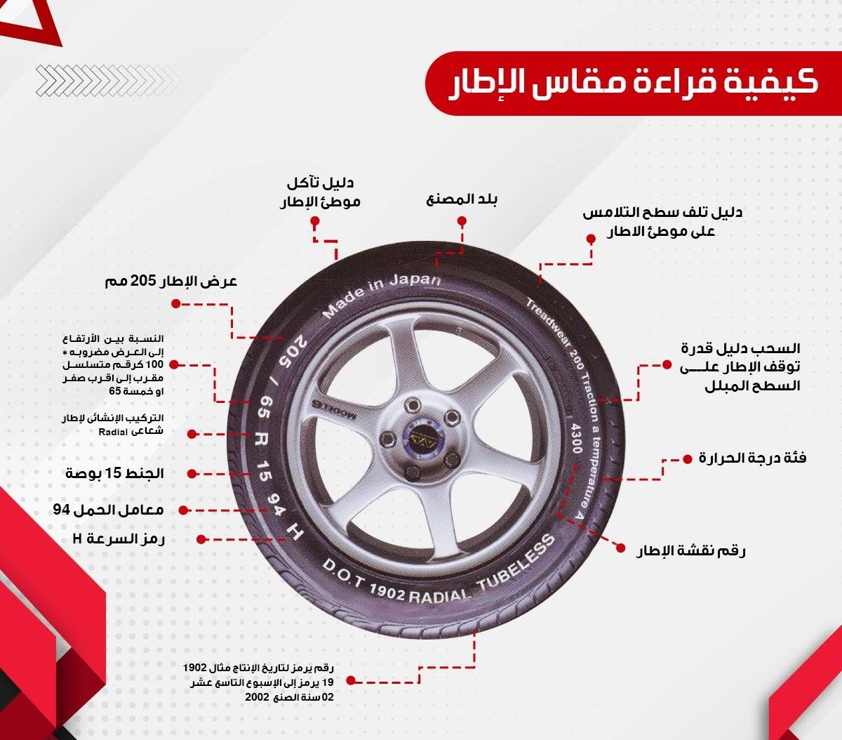 في الجراف التالي , يمكن التعرف على كيفية قراءة مقاس الإطارات من خلال معرفة عدة أمور تشمل رمز سرعة السيارة ومعامل الحمل ومقاس الجنط والنسبة بين الارتفاع والعرض وعرض الاطار ودليل تآكل الاطار وبلد الصنع وغيرها من التفاصيل التي يمكن معرفتها من خلال الجراف التالي الموضح بالتفاصيل :