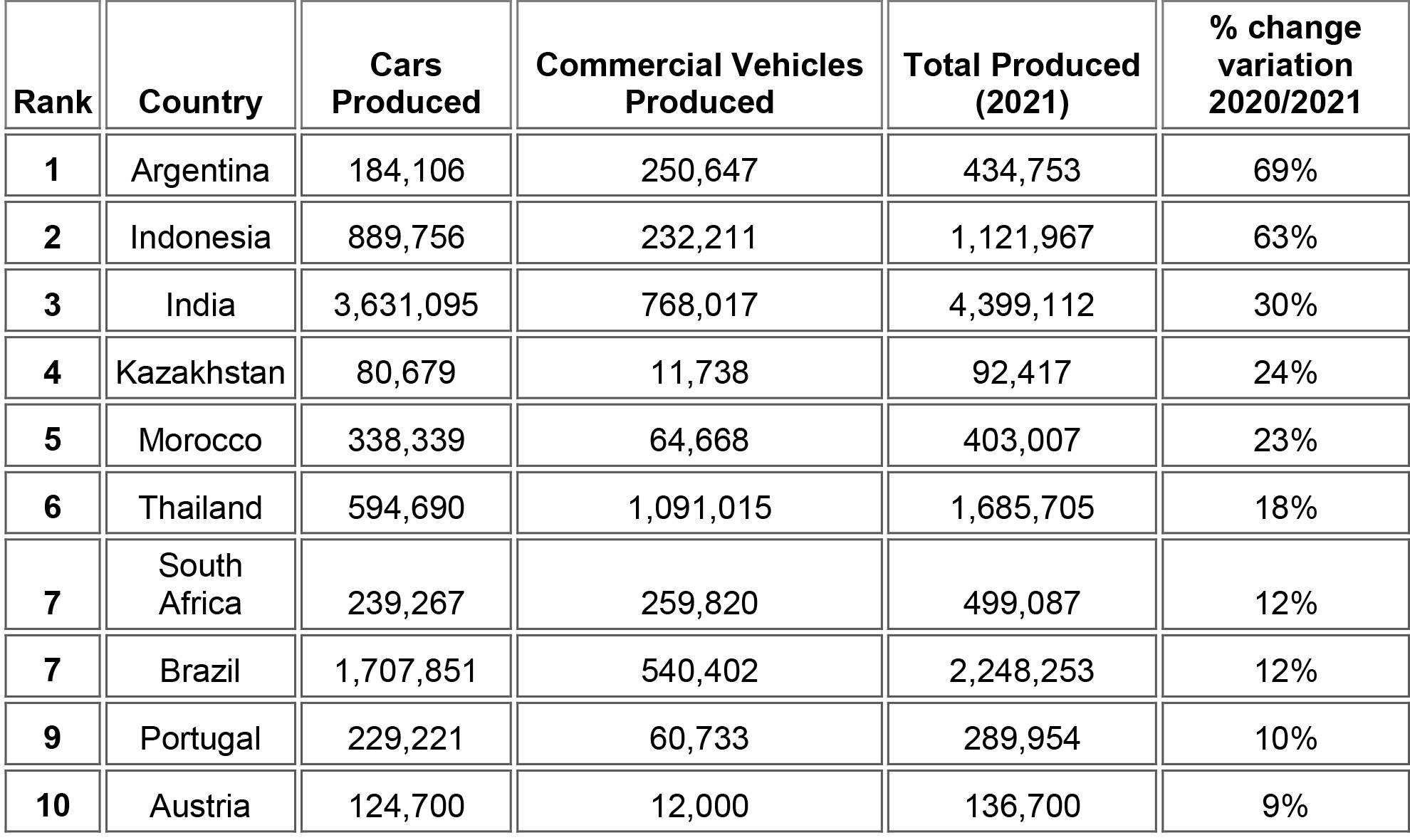 شهدت الأرجنتين أعلى نسبة زيادة في تصنيع السيارات في عام 2021 مقارنة بعام 2020 ، بمعدل 69٪. وتم الإبلاغ عن إنتاجها من السيارات عند 434.753 ألف وحدة في ديسمبر 2021. ويعتبر ذلك زيادة عن العدد السابق البالغ 257.187 وحدة لشهر ديسمبر 2020. وهذا العام ، وافق مجلس الشيوخ الأرجنتيني على مشروع قانون لتعزيز صناعة السيارات.