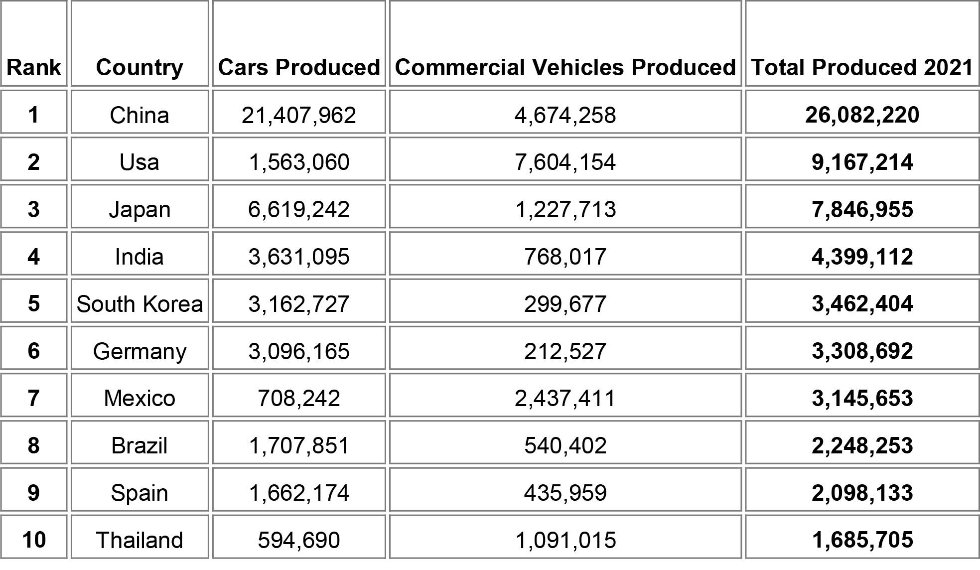 أنتجت الصين معظم السيارات والمركبات التجارية ، بإجمالي 26 مليون صنعت في عام 2021. ومن المتوقع أن يصل إنتاجها المحلي إلى 35 مليون سيارة بحلول عام 2025.