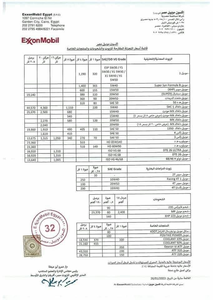 تم الإعلان في مصر عن الأسعار الجديدة لزيوت موبيل محلياً . والأسعار الجديدة بدأت تطبيقها بداية من 26 يناير الجاري وشملت العديد من المنتجات المختلفة من الشركة.