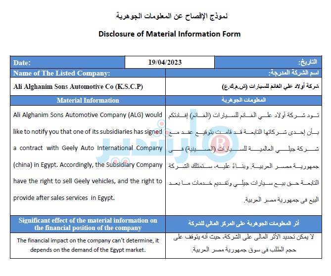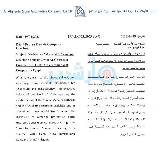 جاء ذلك في بيان ارسلته شركة أولاد على الغانم لبورصة الكويت، الخميس الماضي ، وأوضحت أن الأثر المالي لا يمكن تحديده على الشركة، فهو يتوقف على حجم الطلب في السوق المصرية.