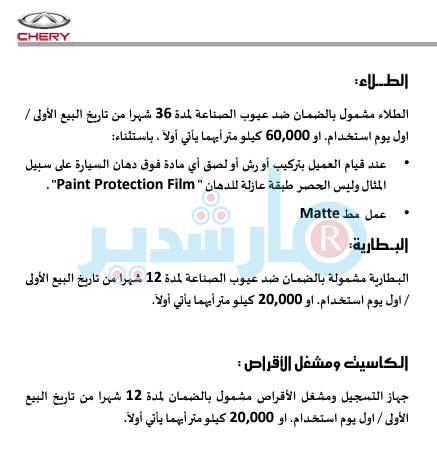 حددت مجموعة غبور الصيانة الدورية لسيارات شيري تيجو 3 لكل 5000 كيلومتر ، مع ضرورةاجراء صيانة عند أول ألف كيلومتر ، مع العلم بأن الضمان على شيري تيجو 3 يبلغ 5 سنوات أو 100000 كيلومتر ايهما أقرب مع بعض الاستثناءات الواردة في الصور التالية :