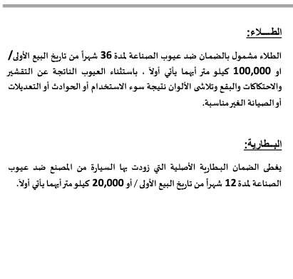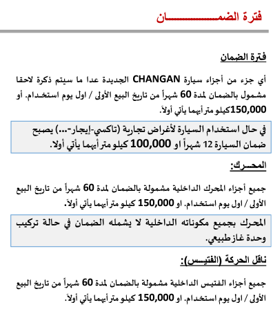 وكيل شانجان يقدم ضمانا شاملا للسيارةلمدة 60 شهر او 150 الف كيلو متر أيهما أقرب، ولكن هناك بعض الاستثناءات نص عليها كتيب الضمان بشكل واضح وصريح، مثل ان السيارة عند استخدامها لغرض تجاري تقل فترة الضمان ، بطارية السيارة لها فترة ضمان بمفردها، أيضا طلاء السيارة تقل فترة الضمان عليه، وكل ذلك موضح بشكل كامل في كتيب الضمان والذي ننشر صورة منه