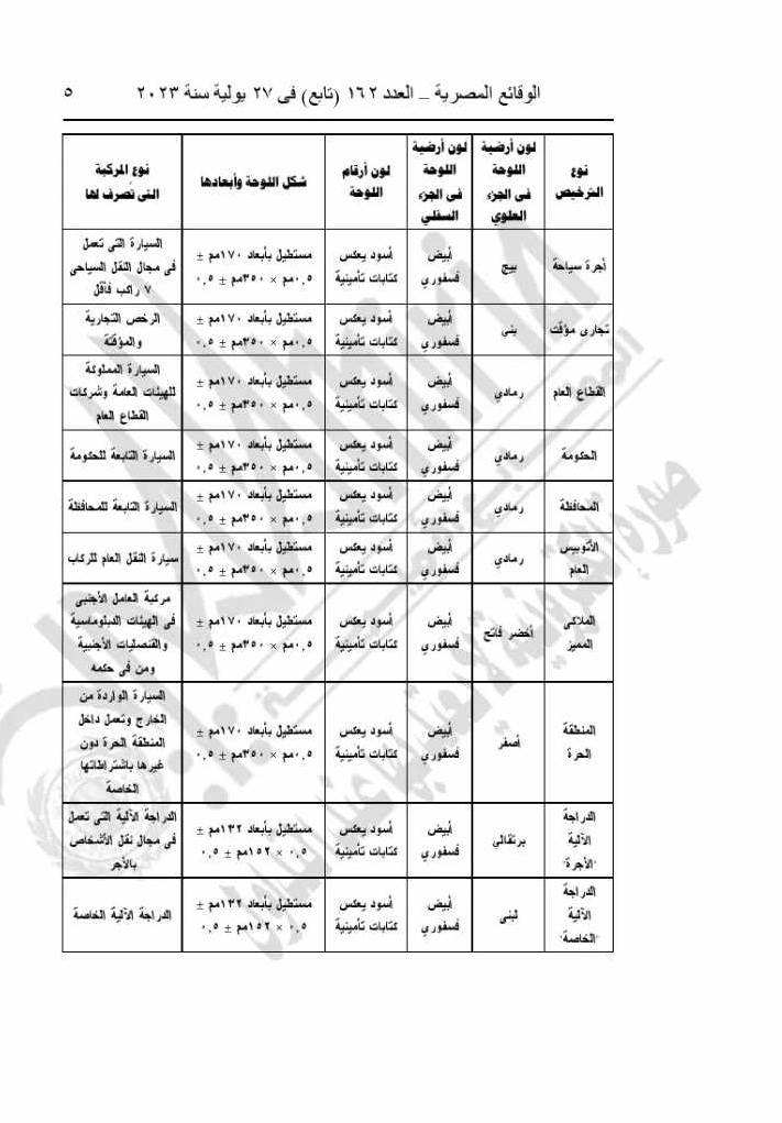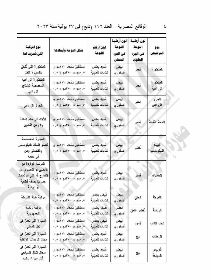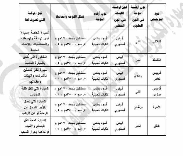تحدد ألوان اللوحات المعدنية وفق الجداول التالية المرفقة :