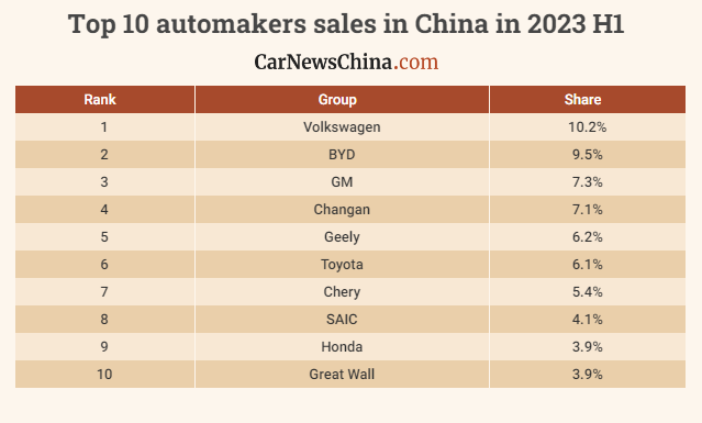 وتشير إحصائيات CPCA إلى أن أفضل 10 شركات لصناعة السيارات من حيث مبيعات السيارات في النصف الأول من عام 2023 في الصين هي فولكس فاجن ، وبي واي دي ، وجنرال موتورز ، وتشانجان ، وجيلي ، وتويوتا ، وشيري ، وسايك ، وهوندا ، وجريت وول.
