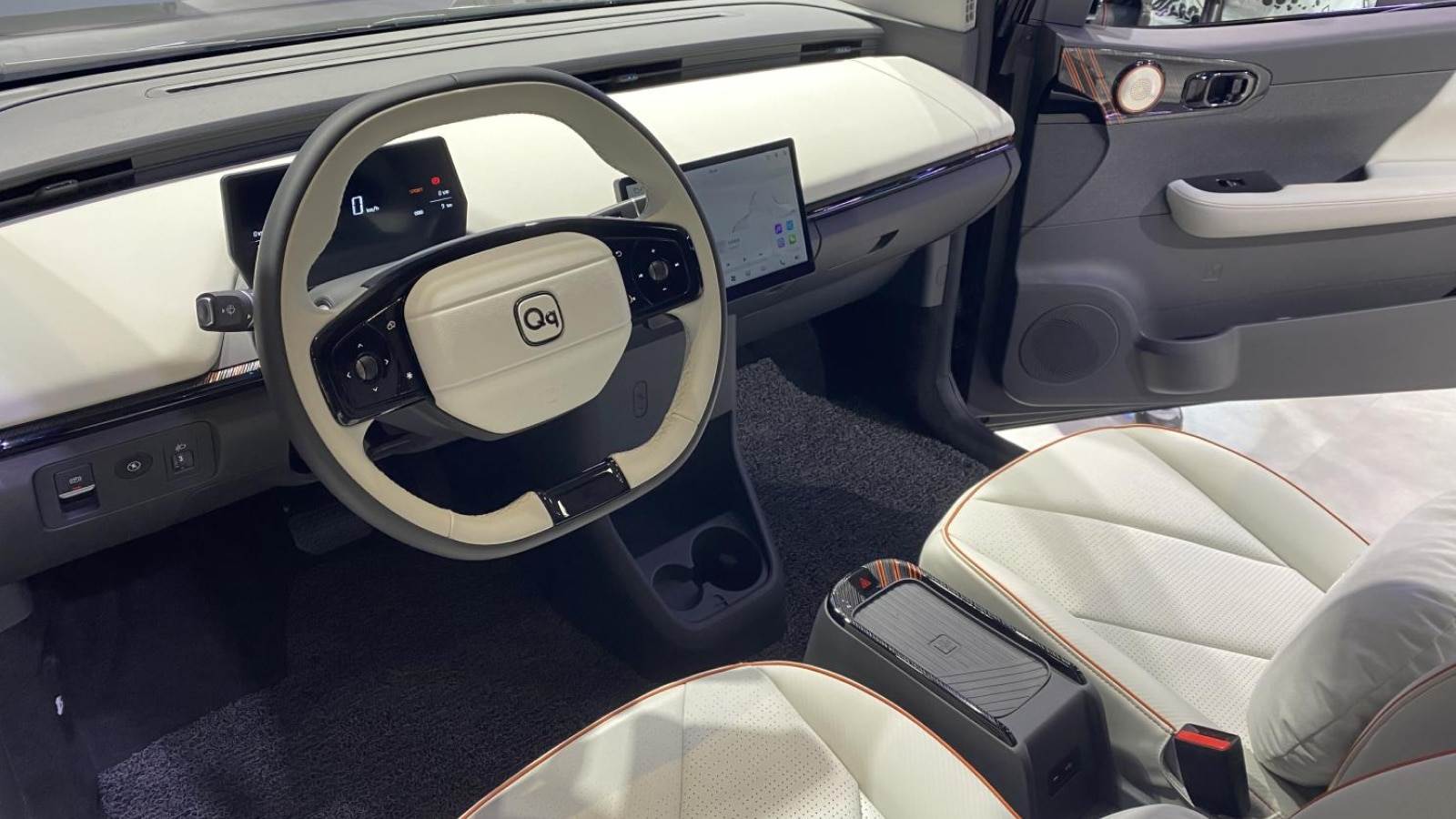 وفي الداخل ، تحتوي eQ1 على عجلة قيادة ثنائية الأضلاع مع قمة وقاع مسطحين. وخلف العجلة ، يمكننا رؤية ناقل الحركة ولوحة أجهزة العدادات LCD. وتحتوي وحدة التحكم المركزية في eQ1 على شاشة انسيابية. وتحت هذه الشاشة ، يمكننا أن نلاحظ حاملي أكواب. ولا يوجد مسند ذراع في eQ1. بدلاً من ذلك ، يوجد لوحة شحن للهاتف اللاسلكي ومنفذين USB.
