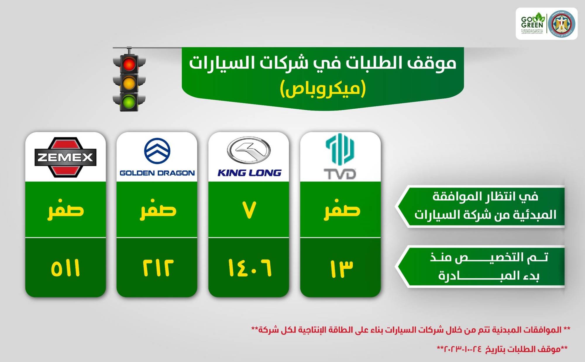 وقدمت قائمة بعدد الطلبات المنتظرة الموافقة المبدئية من شركات السيارات لجميع الموديلات الموجودة داخل مبادرة إحلال السيارات المتقادمة بتاريخ ٢٤ / ١٠ / ٢٠٢٣ كالتالي :