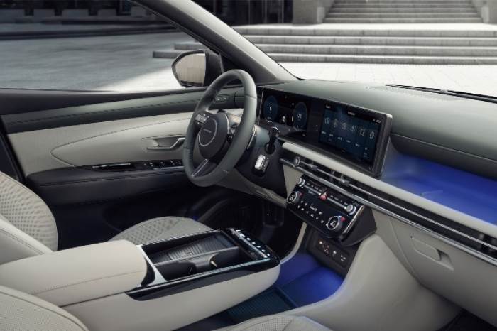 وحدث أكبر التغييرات في الداخل وتتميز السيارة بمقصورة داخلية جديدة بشاشة منحنية بانورامية تجمع بين لوحة العدادات مقاس 12.3 بوصة ونظام المعلومات والترفيه مع وحدة تحكم انسيابية بأزرار للتكييف. يمتد شريط به فتحات تهوية على كامل عرض الجزء الداخلي. ويؤكد التصميم على الخطوط الأفقية لإضفاء إحساس بالرحابة. وتعمل الشاشة أيضًا على تشغيل الجيل التالي من نظام المعلومات والترفيه داخل السيارة من هيونداي. كما يوجد كونسول جديد وواسع يحتوي على العديد من حجرات التخزين وحاملات الأكواب ولوحة الشحن اللاسلكي. وتم نقل محدد التروس لناقل الحركة الأوتوماتيكي خلف عجلة القيادة، وهي جديدة أيضًا وتبدو رياضية تمامًا بفضل التصميم ثلاثي الأضلاع.