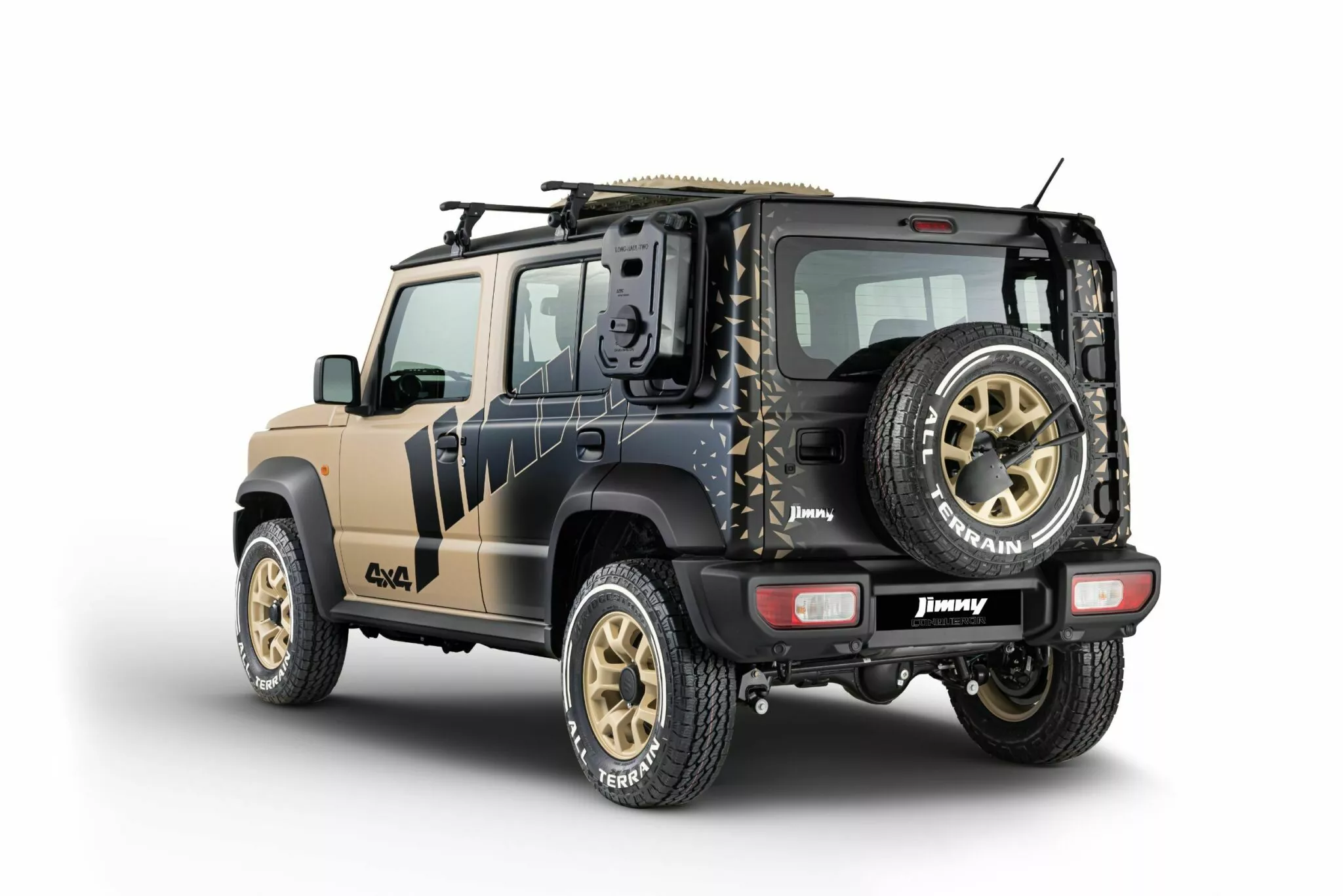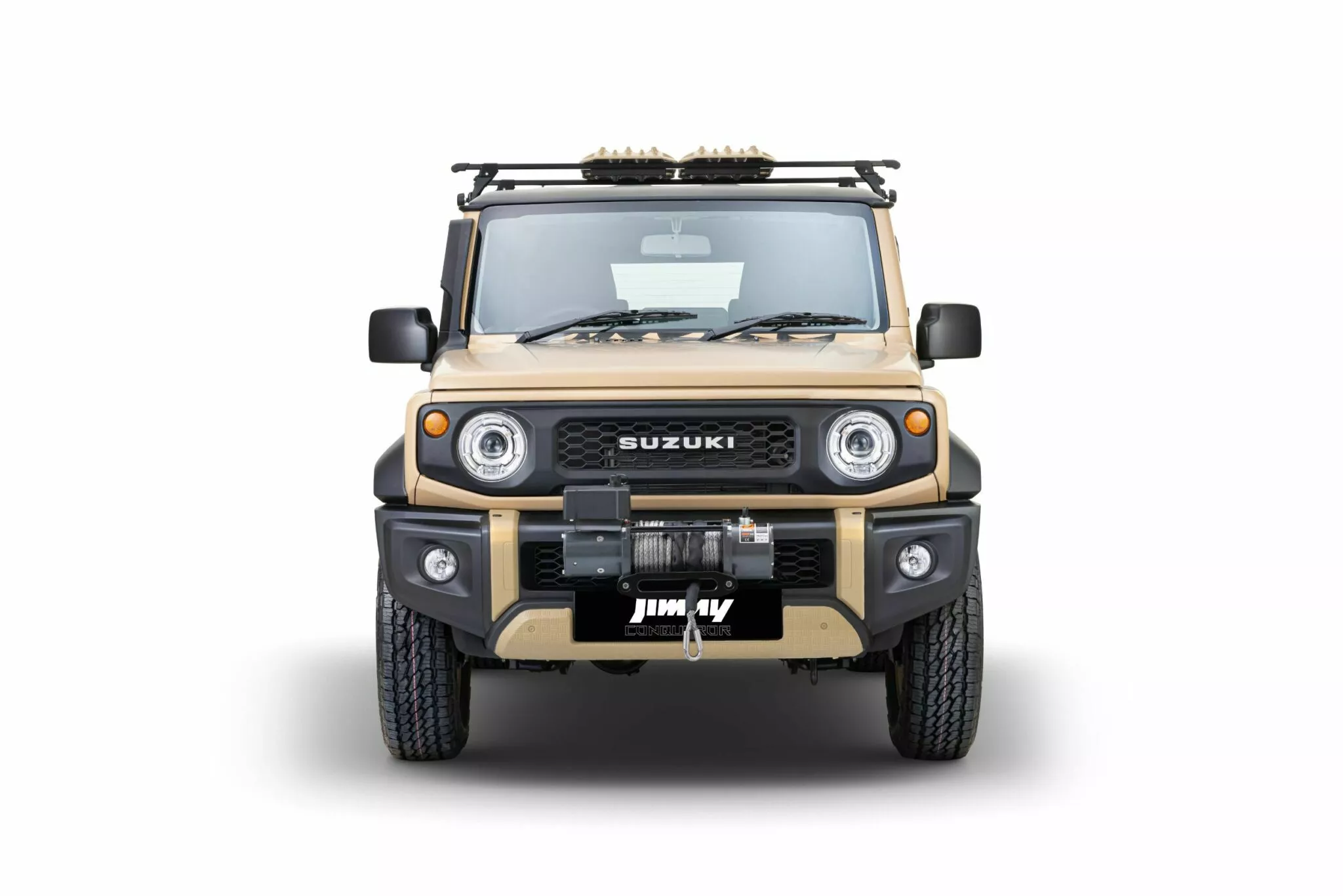وفي المقدمة، توجد شبكة أمامية أكثر أناقة ولوح انزلاق بلون الهيكل، بينما تم تجهيز العجلات المعدنية مقاس 16 بوصة بإطارات لجميع التضاريس. كما زودت سوزوكي السيارة التجريبية برافعة، وسلم خلفي، وفتحات تهوية، وقضبان سقف، وإطارات ثلجية، وخزان وقود إضافي مثبت على الجانب.