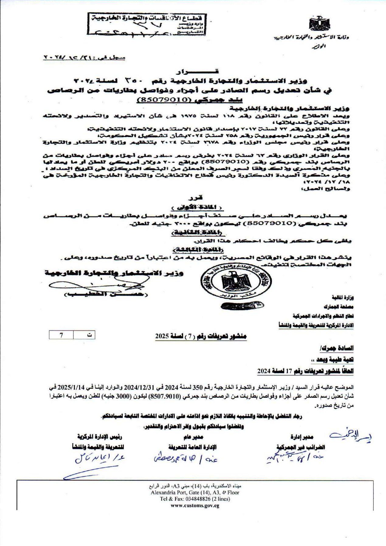 أعلنت وزارة الاستثمار والتجارة الخارجية عن منشور تعريفات رقم (14) لسنة 2025بخصوص قرار وزير الاستثمار والتجارة الخارجية رقم 50 لسنة 2025 بتعديل احكام القرار الوزاري رقم 116 لسنة 2021 بفرض رسوم نهائية لمكافحة الاغراق على الواردات من صنف إطارات خارجية هوائية جديدة، من مطاط من الأنواع المستعملة للحافلات الاتوبيسات والشاحنات عدا سيارات النقل الخفيف نصف نقل المصدرة من أو ذات منشأ الصين وتايلاند والذي تم نشره في الوقائع المصرية بالعدد رقم 32 تابع (ج) بتاريخ 2025/2/9 ويعمل به لمدة سنتين اعتبارا من تاريخ نشره.