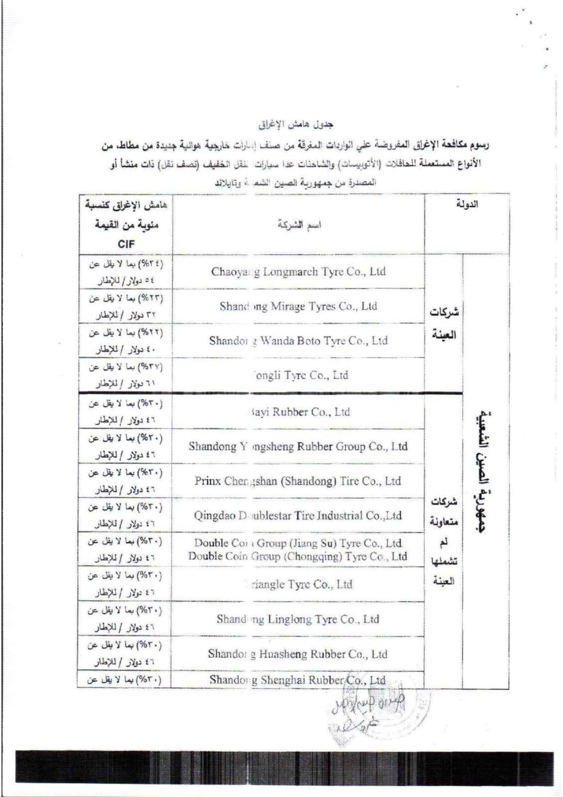 قرار صدر في 2021 برسوم اغراق على اطارات صينية ومن تايلاند