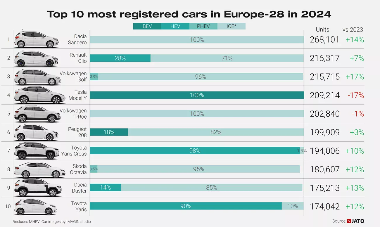 وباعت رينو سانديرو 268.101 الف سيارة، بزيادة 14 بالمائة عن عام 2023. كما احتلت رينو بسيارتها كليو المركز الثاني وارتفعت بنسبة 7 بالمائة إلى 216317 وحدة، لكن فولكس فاجن جولف كانت خلفها مباشرة بعدد 215715، وهذا الرقم ارتفع بنسبة 17 بالمائة مقارنة بالعام السابق.