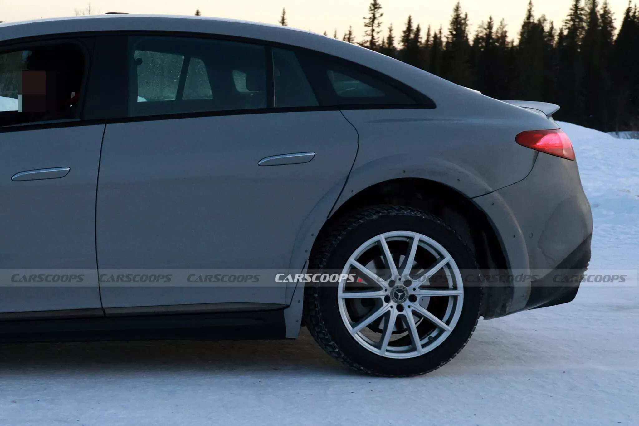 ويكشف النظر عن قرب عن وضع غريب للعجلات وللجناح. ويعطي شكل امتداد قاعدة العجلات للموديل الاختباري الانطباع بأن السيارة الجديدة ستكون أقصر من قاعدة عجلات EQE التي يبلغ طولها 3120 ملم، ولكنها أطول من 2961 ملم للفئة E W214 الحالية.