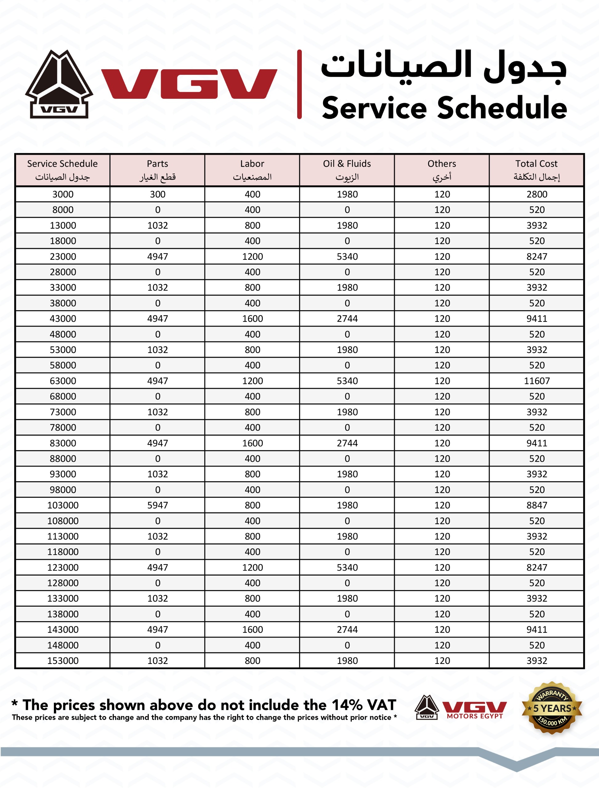 كشفت شركة VGV ايجيبت وكيل سيارات VGV في السوق المصري عن جدول الصيانات الدورية لسياراتها في السوق المصري في الفترة الحالية. وشمل جدول الصيانات أقل مسافة صيانة ممكنة تبدأ من 3000 كم كبداية وصولاً الي 153 ألف كم صيانة. وتتراوح تكلفة الصيانة من 520 جنيه كبداية وتصل الي أكثر من 11 ألف جنيه لبعض الصيانات . وتشمل الأسعار الزيوت وقطع الغيار والمصنعيات. فيما وضحت الشركة أن الأسعار المعلنة لا تشمل ضريبة القيمة المضافة بنسبة 14% . وتقدم السيارات بضمان يبلغ 5 سنوات أو 150 ألف كم.
