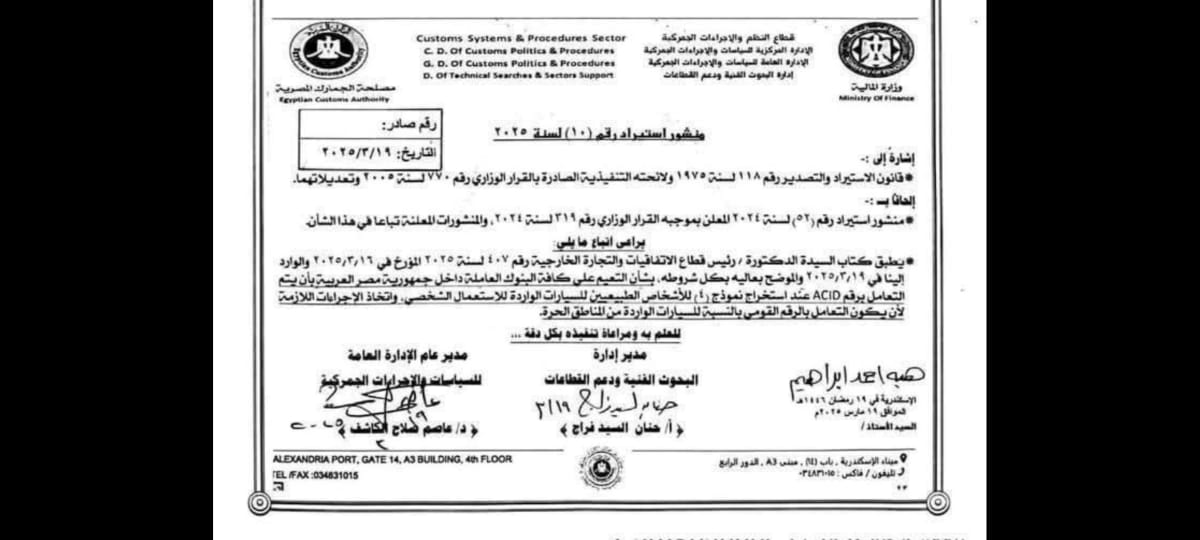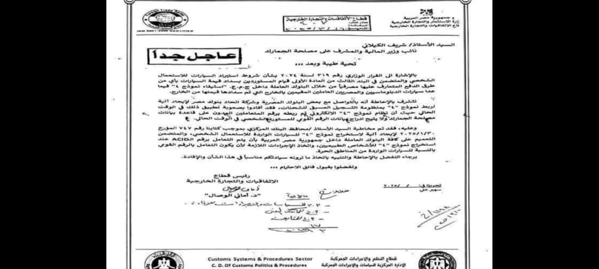 أعلنت وزارة المالية في منشور جديد عن التعميم على كافة البنوك العاملة في مصر بأن يتم التعامل برقم ACID عند استخراج نموذج 4 للأشخاص الطبيعيين للسيارات الواردة للاستعمال الشخصي واتخاذ الاجراءات اللازمة بأن يكون التعامل بالرقم القومي بالنسبة للسيارات الواردة من المناطق الحرة. وجاء ذلك وفق منشور المالية الصادرة من قطاع الاتفاقيات والتجارة الخارجية رقم 407 لسنة 2025 . وياتي القرار في ظل الاعلان عن شروط استيراد السيارات للاستعمال الشخصي والمتضمن في البند الثالث من المادة الأولي بخصوص قيام المستورد بسداد قيمة السيارة بأي من طرق الدفع المتعارف عليها مصرفياً من خلال البنوك العاملة داخل جمهورية مصر العربية واستيفاء نموذج 4 فيما عدا سيارات الدبلوماسيين والمصريين العاملين في الخارج التي تم سداد قيمتها من الخارج.