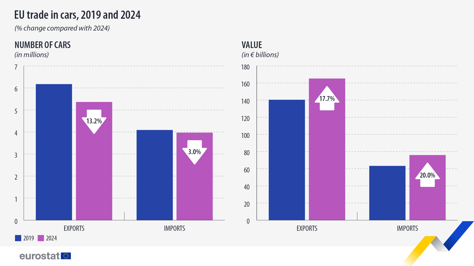 في عام 2024، صدّر الاتحاد الأوروبي 5.4 مليون سيارة واستورد 4 ملايين سيارة. وبالمقارنة مع عام 2019، انخفض عدد السيارات المصدرة بنسبة 13.2%، بينما انخفض عدد السيارات المستوردة بنسبة 3%. ومن حيث القيمة، في عام 2024، صدّر الاتحاد الأوروبي سيارات بقيمة 165.2 مليار يورو، واستورد سيارات بقيمة 75.9 مليار يورو، مما أدى إلى فائض تجاري قدره 89.3 مليار يورو. وبالمقارنة مع عام 2019، ارتفعت الصادرات بنسبة 17.7% بمعدل أكثر من 24.8 مليار يورو، وارتفعت الواردات بنسبة 20% بقيمة أكثر من 12.7 مليار يورو.