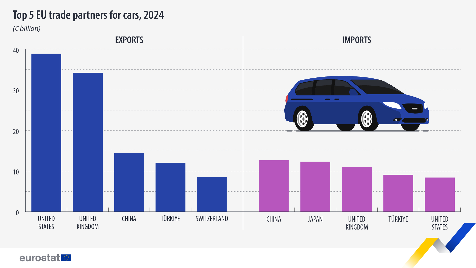 وبالنسبة لواردات السيارات إلى الاتحاد الأوروبي، كانت الصين واليابان أكبر الموردين، بقيمة 12.7 مليار يورو و12.3 مليار يورو على التوالي. وجاءت المملكة المتحدة في المرتبة الثالثة بقيمة 11 مليار يورو، تليها تركيا بقيمة 9.1 مليار يورو، ثم الولايات المتحدة بقيمة 8.4 مليار يورو.
