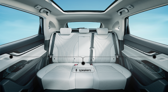 كما تجهز السيارة في الخارج بعوارض تحميل فوق السقف واسبويلر خلفي وعجلات ألومنيوم 19 بوصة ومصابيح أمامية LED ومصابيح خلفية LED ووحدات اضاءة نهارية DRL واضاءة محيطية داخلية.