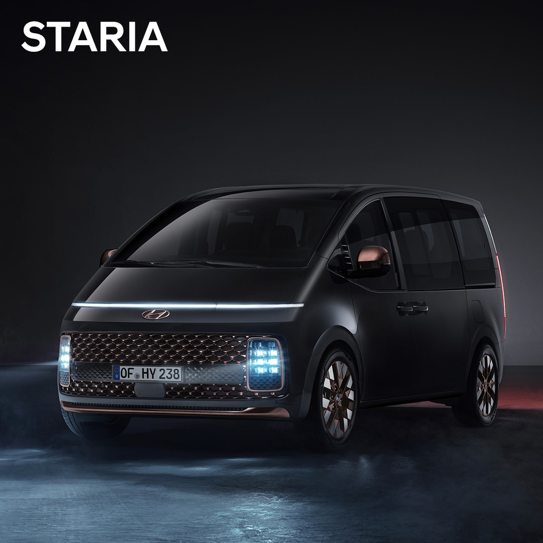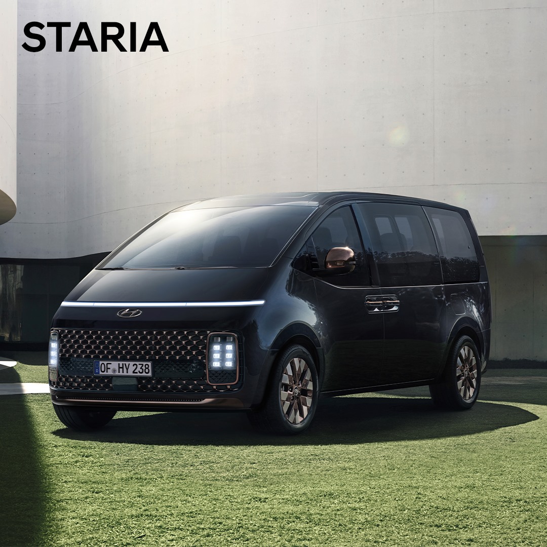 تقدم هيونداي STARIA تصميماً مستقبلياً مستوحى من فلسفة هيونداي المبتكرة التي تمزج بين البساطة والتكنولوجيا العالية، حيث يتميز التصميم الخارجي بخطوط انسيابية جذابة وواجهة أمامية جريئة تضم مصابيح LED بالكامل لإضفاء طابع عصري مميز،ويعتمد التصميم على فكرة "الانحناءة الواحدة" التي تمنح السيارة مظهراًمتماسكاًوأنيقاً، مما يجعلها تحفة فنية على الطرق.