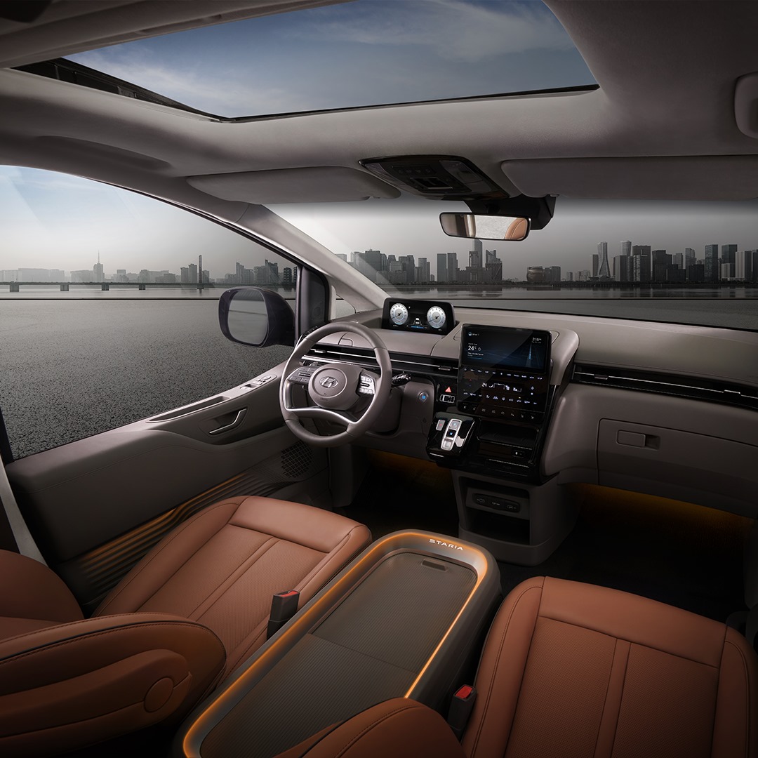 تتمتع سيارة هيونداي STARIA بتجهيزات داخلية فاخرة ومريحة، حيث تأتي بعجلة قيادة مكسوة بالجلد مع خاصية التسخين. تضم السيارة فرش جلد للمقاعد وأعتاب داخلية من الكروم، مما يضيف لمسة من الفخامة للمقصورة. كما تحتوي على مخرج كهربائي في صندوق الأمتعة وشاحن USB أمامي وخلفي لتلبية احتياجات الأجهزة الإلكترونية.