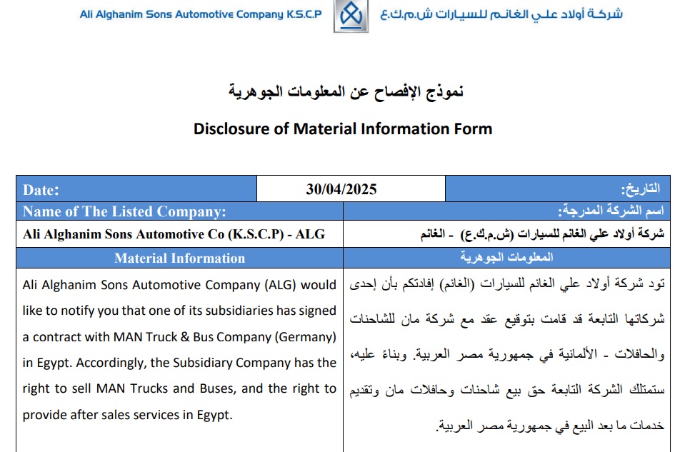 أولاد علي الغانم تمتلك حق وكالة شاحنات وحافلات مان بمصر