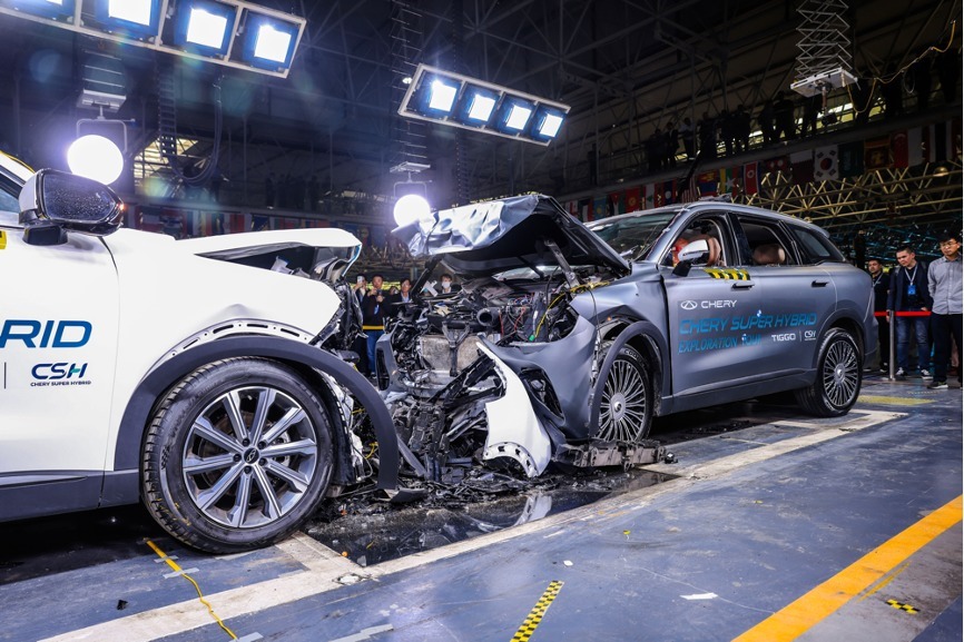 في التحدي الأول، والذي تمثل في تصادم أمامي كامل بين سيارتين من طراز TIGGO9 CSH، انطلقت السيارتان باتجاه بعضهما بسرعة 56 كم/س، في محاكاة دقيقة لحادث واقعي. وعلى عكس اختبارات التصادم التقليدية التي تتم عادةً ضد حواجز ثابتة، أنتج هذا التصادم المتحرك طاقة حركية أعلى بكثير، ما زاد من تعقيد الاختبار وواقعيته.