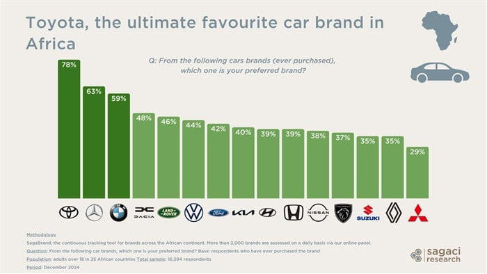 وبحسب شركة ساجاتشي للأبحاث، تتصدر تويوتا تصنيفات العلامات التجارية في أفريقيا بنسبة تفضيل تبلغ 78% بين أولئك الذين يمتلكون واحدة، تليها مرسيدس (63%) ثم بي إم دبليو (59%). وتعود شعبيتها إلى متانتها وسهولة الوصول إلى قطع الغيار - ويرجع ذلك جزئيًا إلى شراكتها مع CFAO، التي تدعم شبكة توزيع قوية، وخاصة في غرب ووسط أفريقيا.